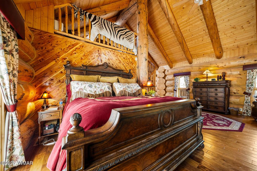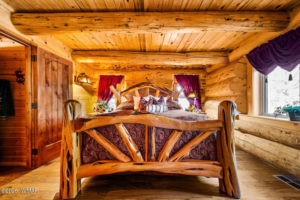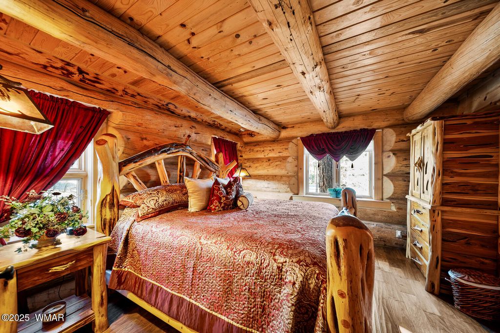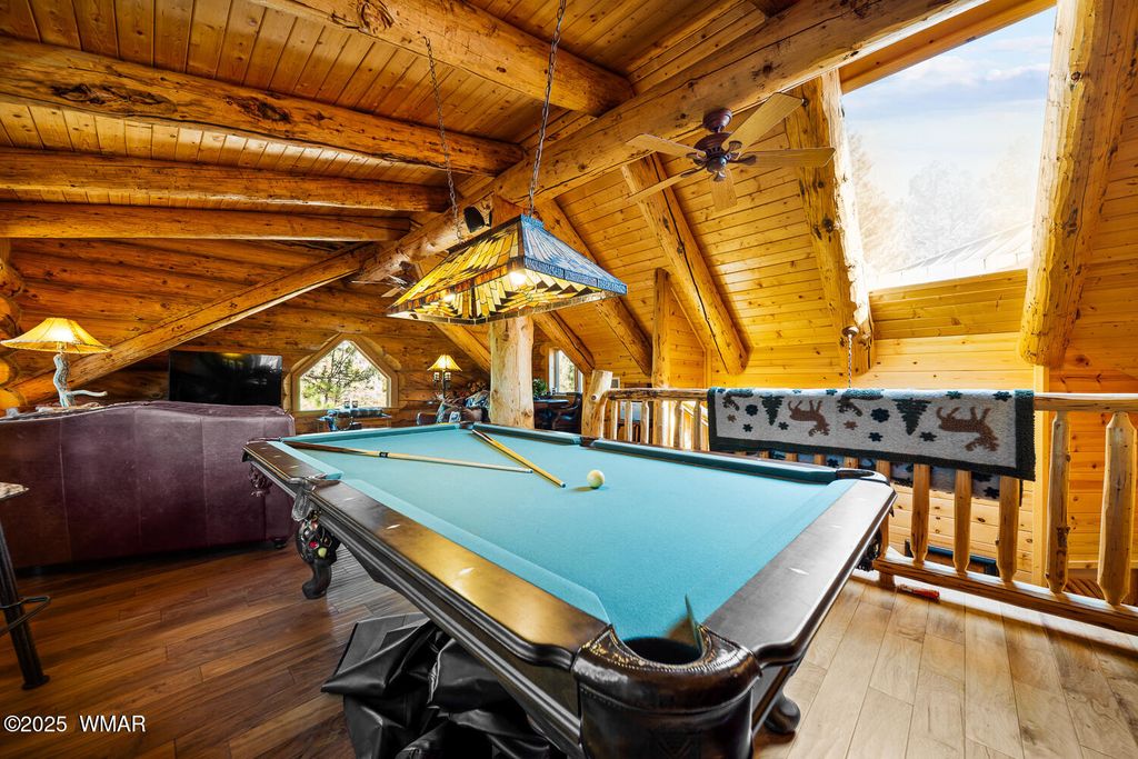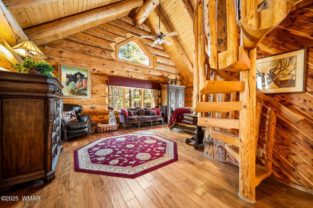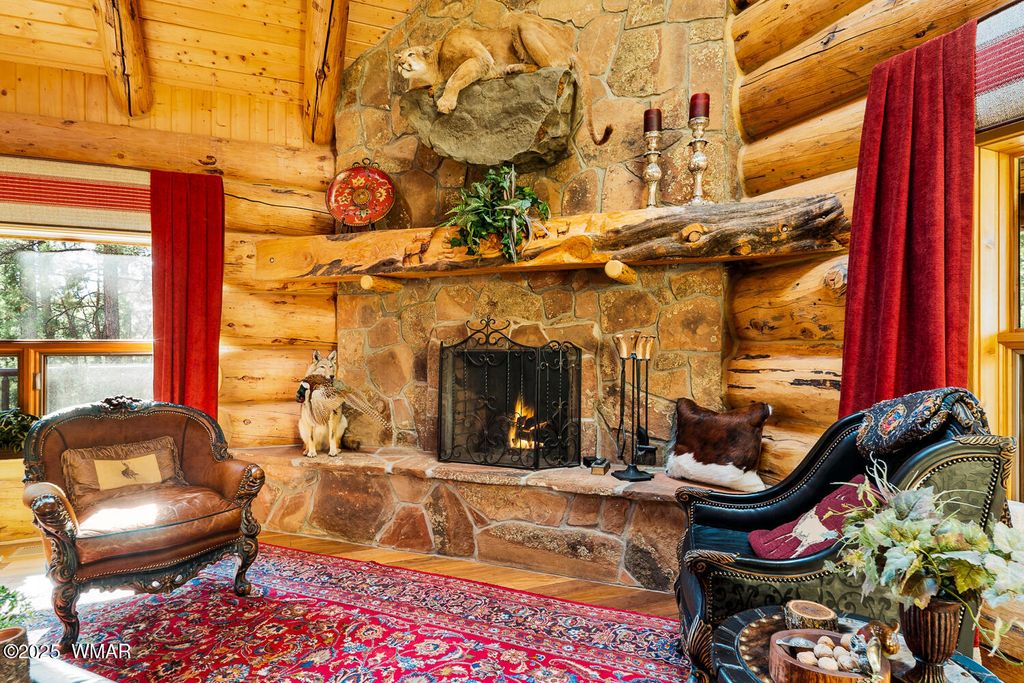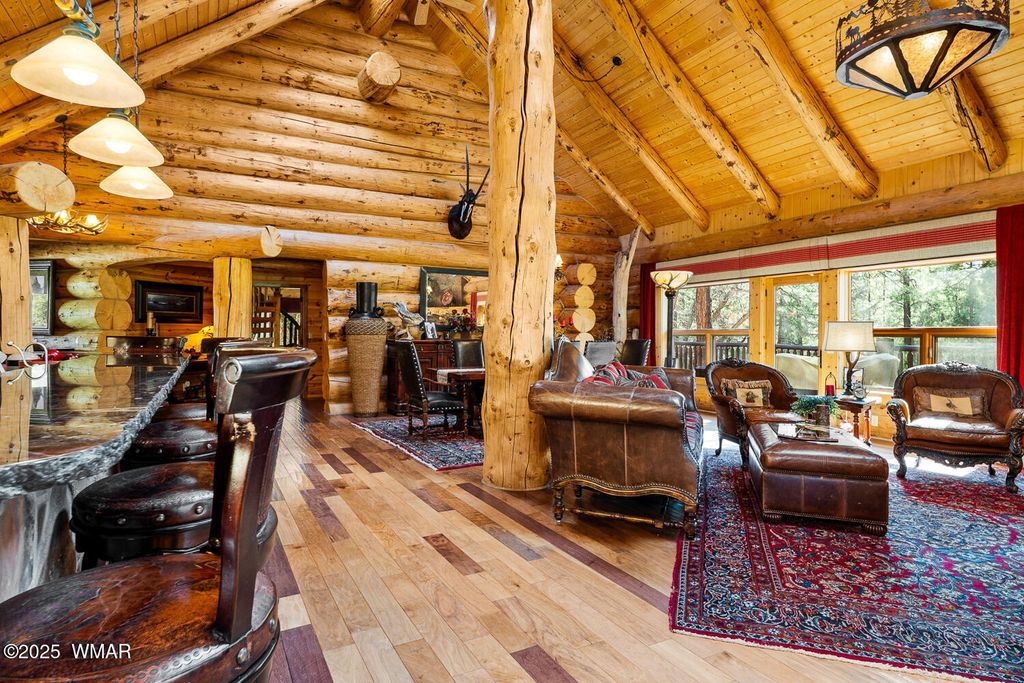 Incredibly rare full log home on the 15th fairway of the prestigious Cabin Course in Torreon. Nestled in the Tall Ponderosa Pine Trees at the end of the Little Leaf cul-de-sac, this is the home to make your great escape to Mountain life. As soon as you step inside, you will be awe-inspired by the spectacular craftmanship of it's full log beauty. Enjoy the open-concept living area that will keep the festivities going from the kitchen to the dining area, to the cozy gas fireplace made for a true mountain getaway. Your guests can relax in their own rooms with a Jack and Jill bathroom. The primary bedroom features its own loft and an abundance of space. The upstairs loft provides ample space for more entertaining. Outside, enjoy stunning views of the Cabin Course from the impressive deck!