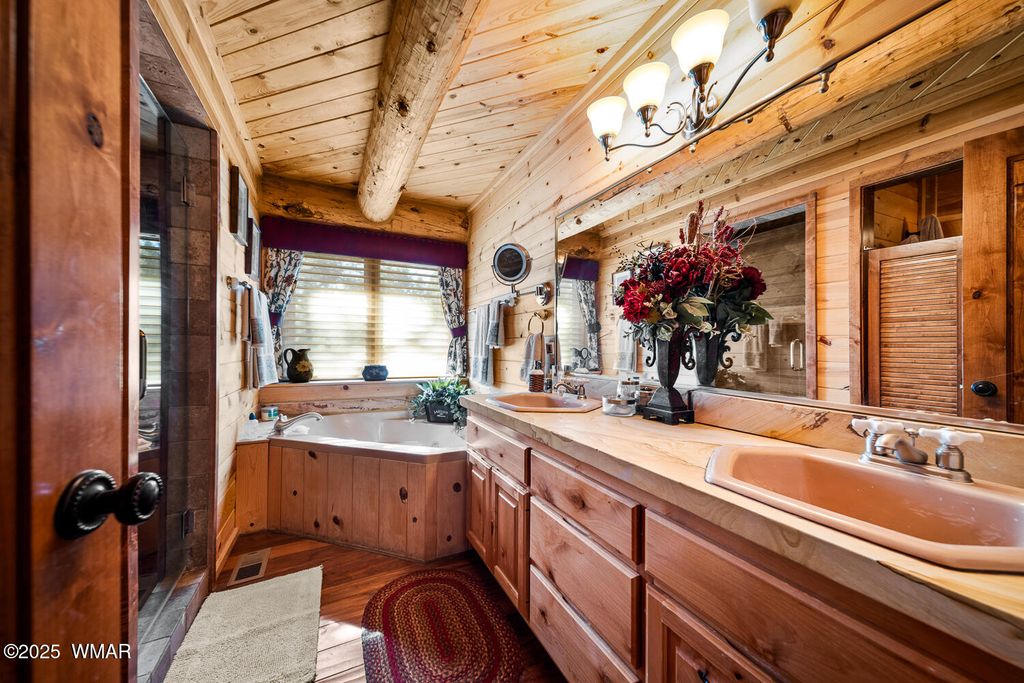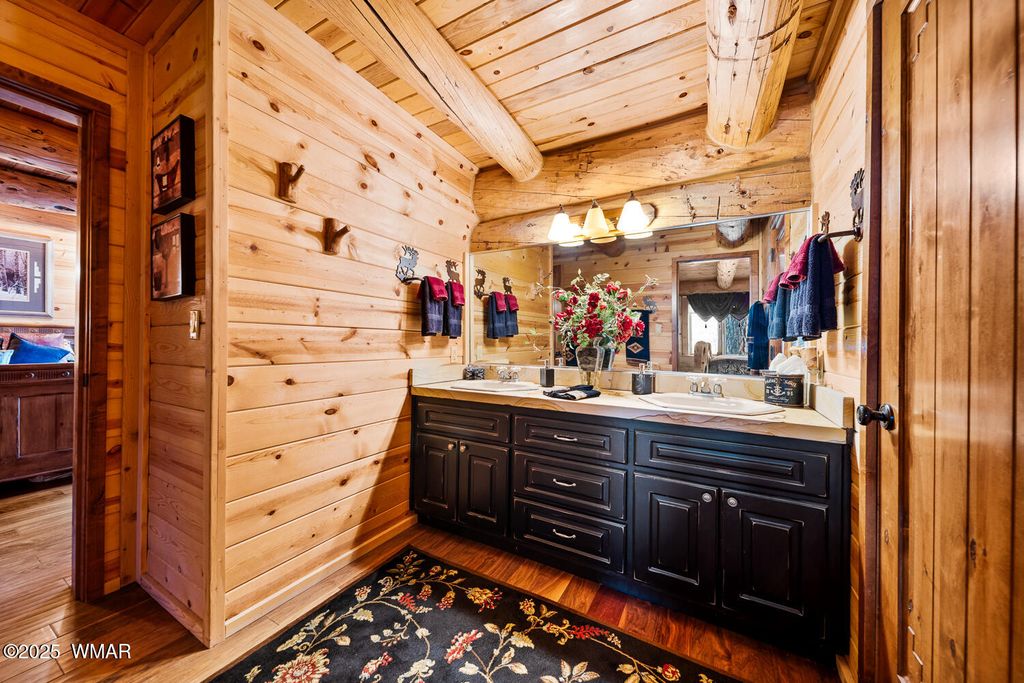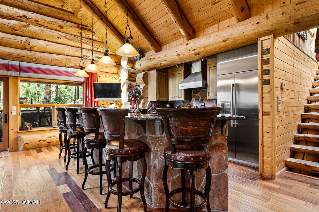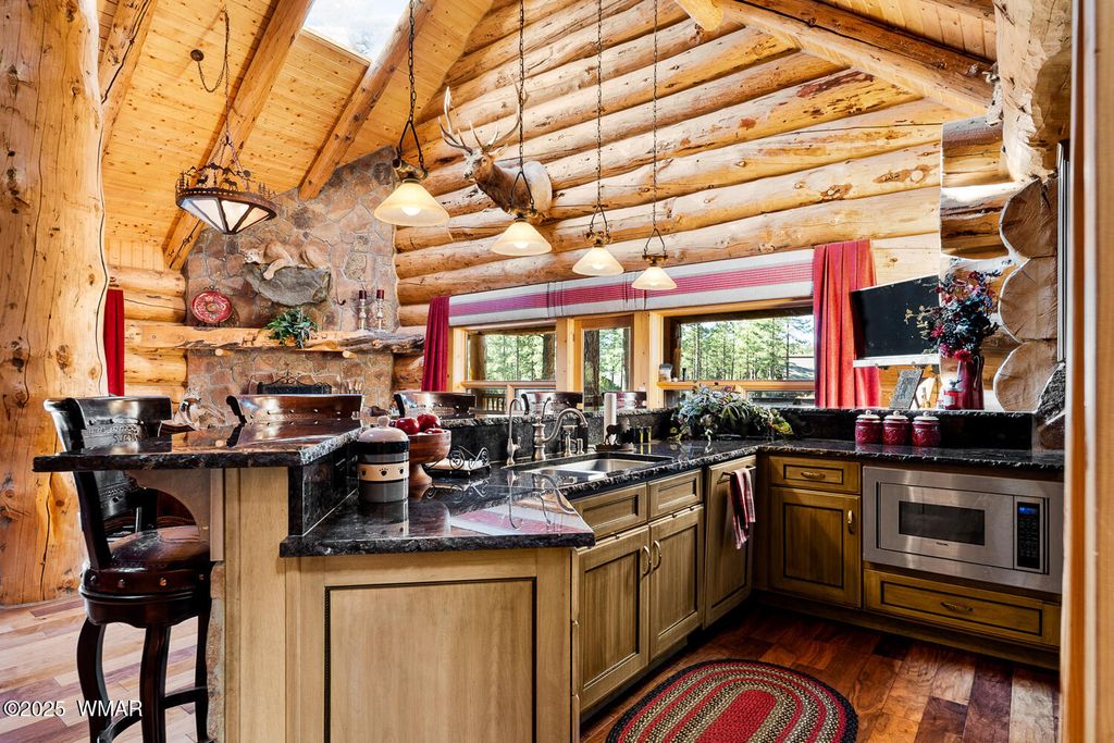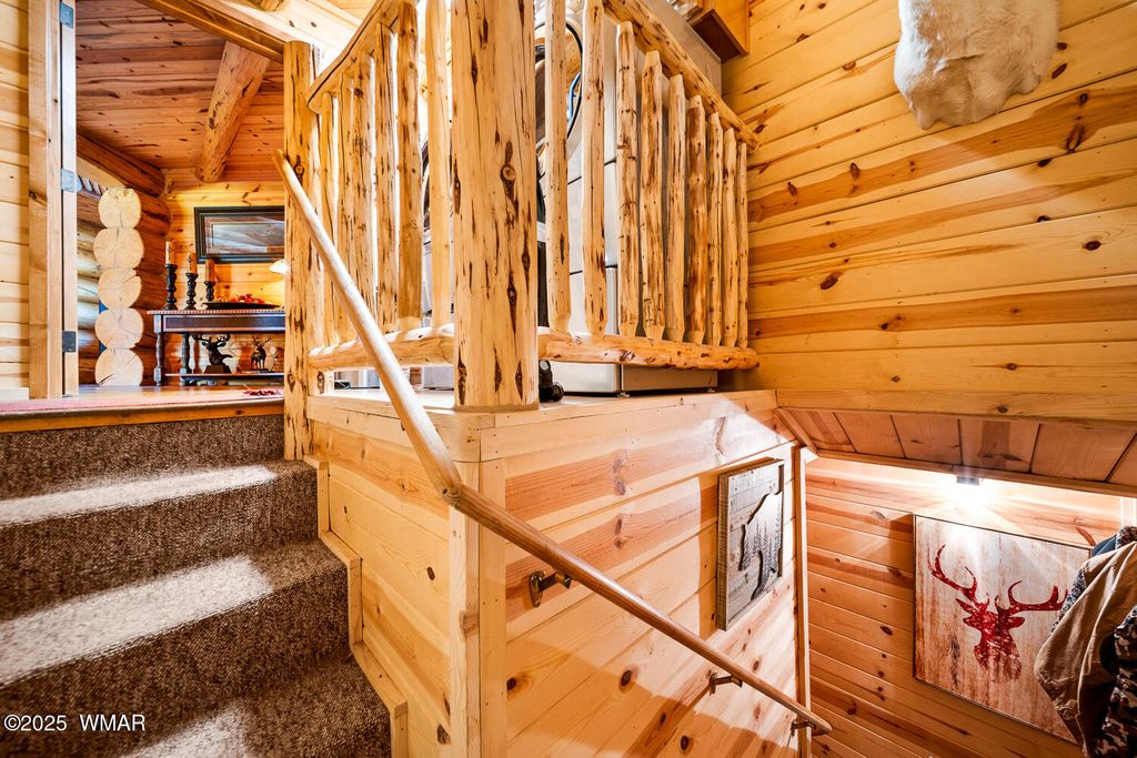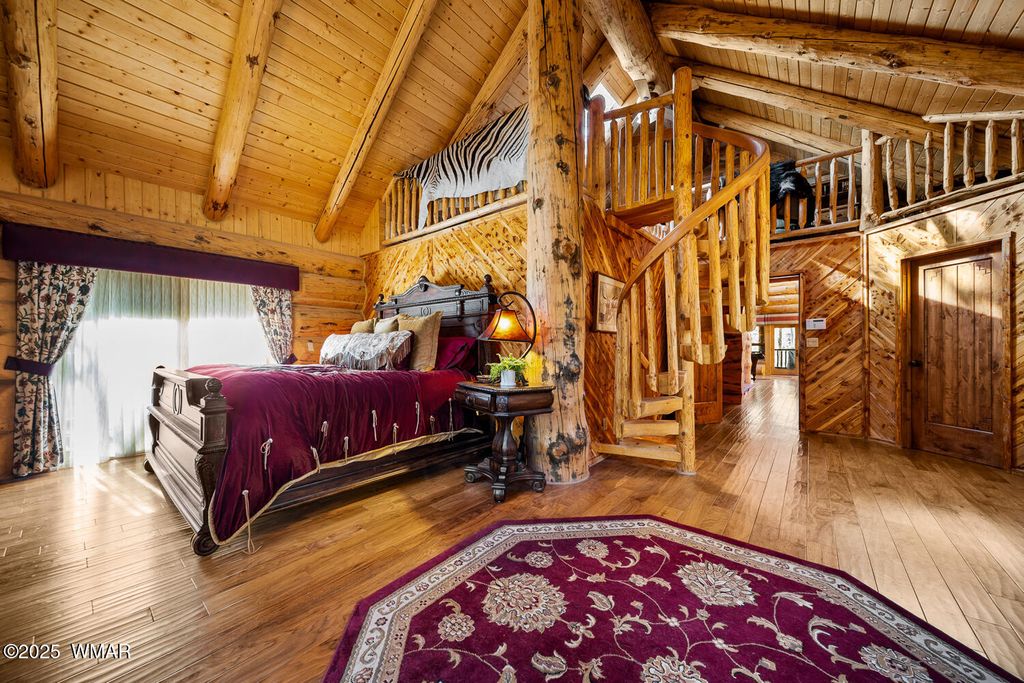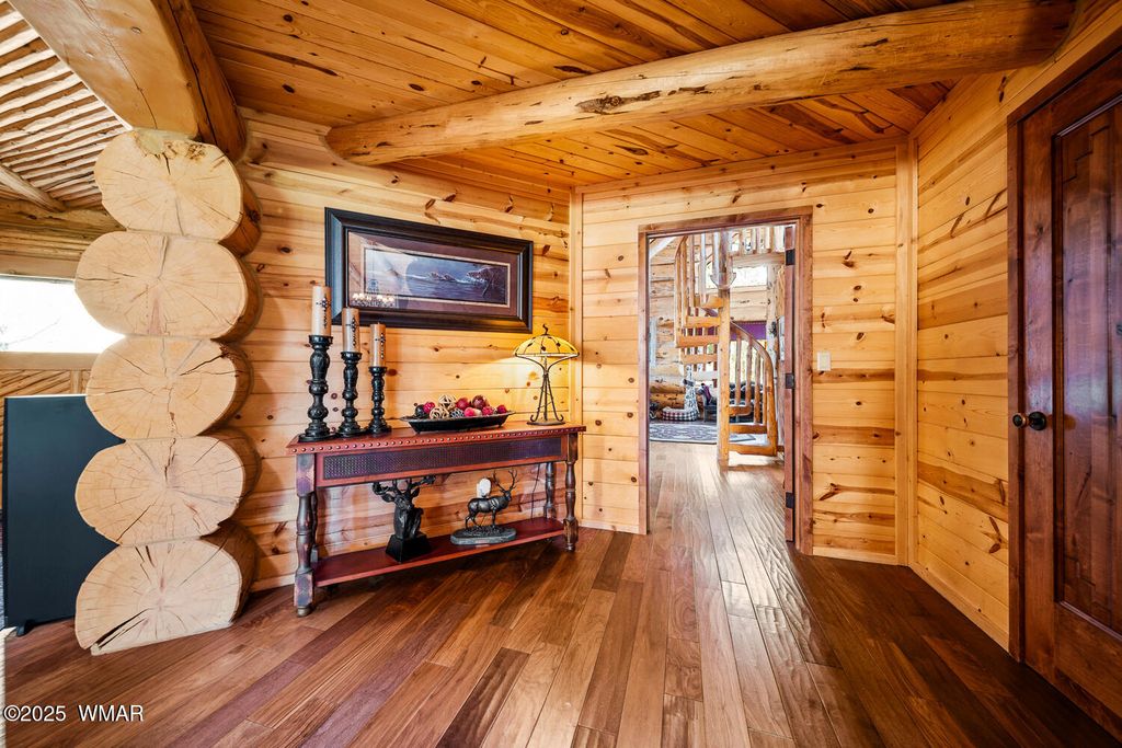 Incredibly rare full log home on the 15th fairway of the prestigious Cabin Course in Torreon. Nestled in the Tall Ponderosa Pine Trees at the end of the Little Leaf cul-de-sac, this is the home to make your great escape to Mountain life. As soon as you step inside, you will be awe-inspired by the spectacular craftmanship of it's full log beauty. Enjoy the open-concept living area that will keep the festivities going from the kitchen to the dining area, to the cozy gas fireplace made for a true mountain getaway. Your guests can relax in their own rooms with a Jack and Jill bathroom. The primary bedroom features its own loft and an abundance of space. The upstairs loft provides ample space for more entertaining. Outside, enjoy stunning views of the Cabin Course from the impressive deck!