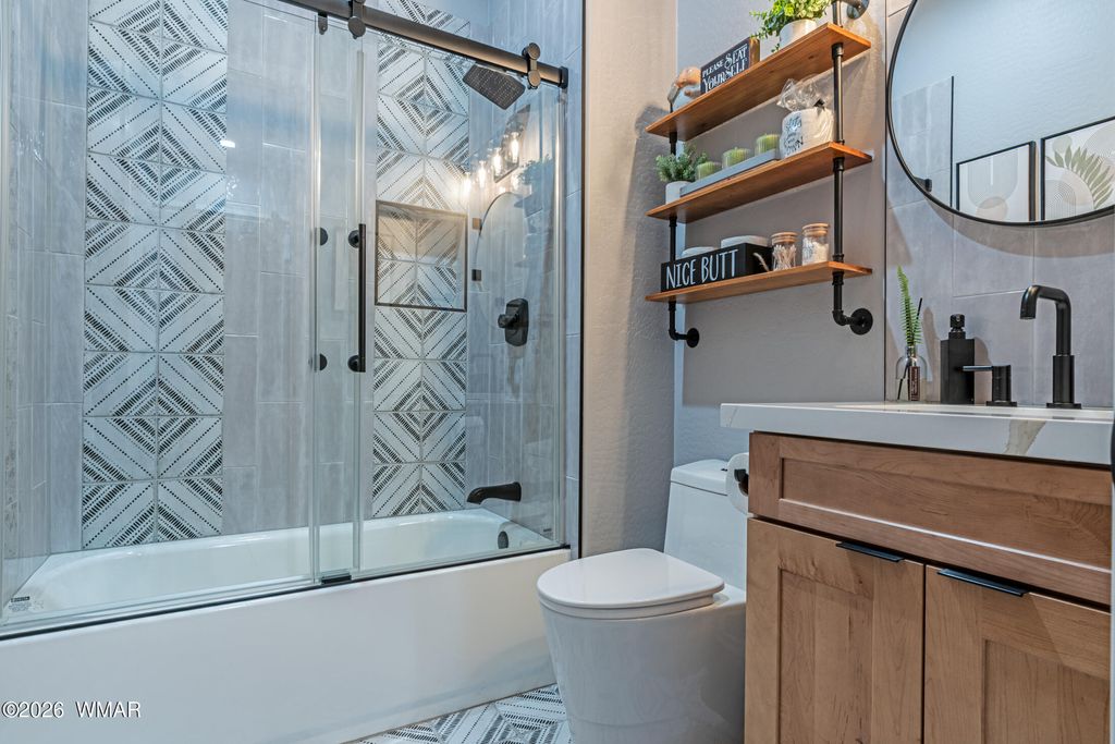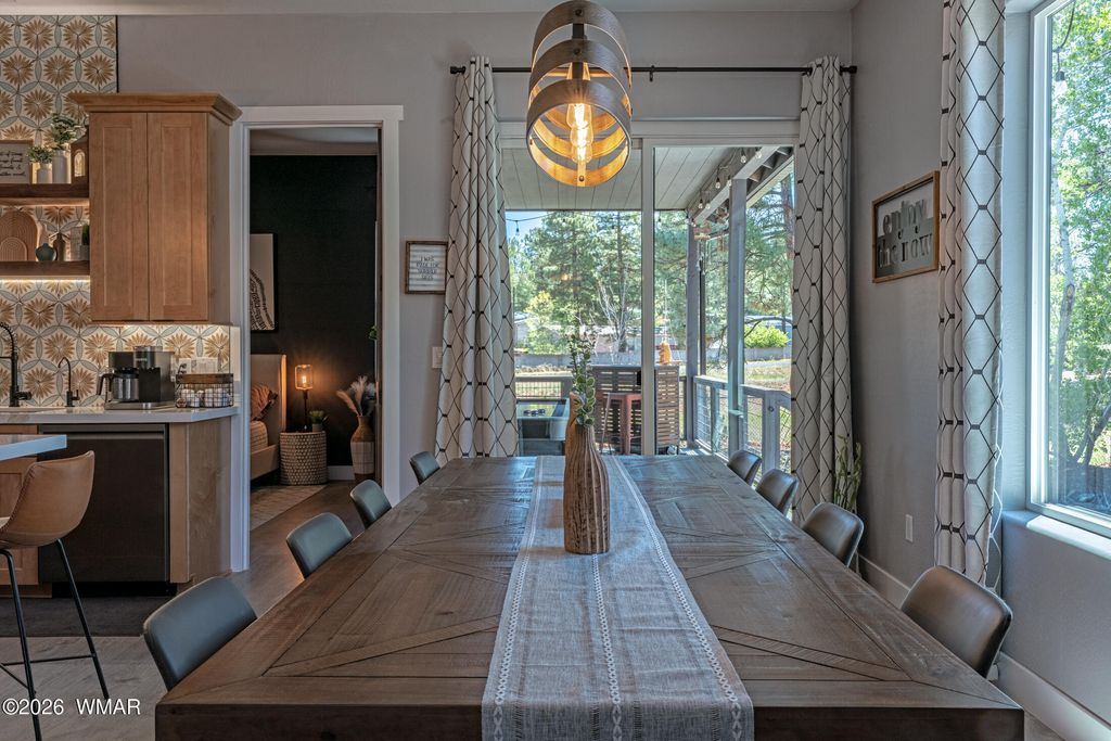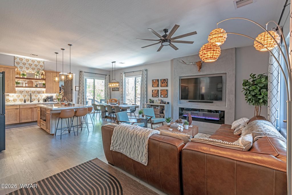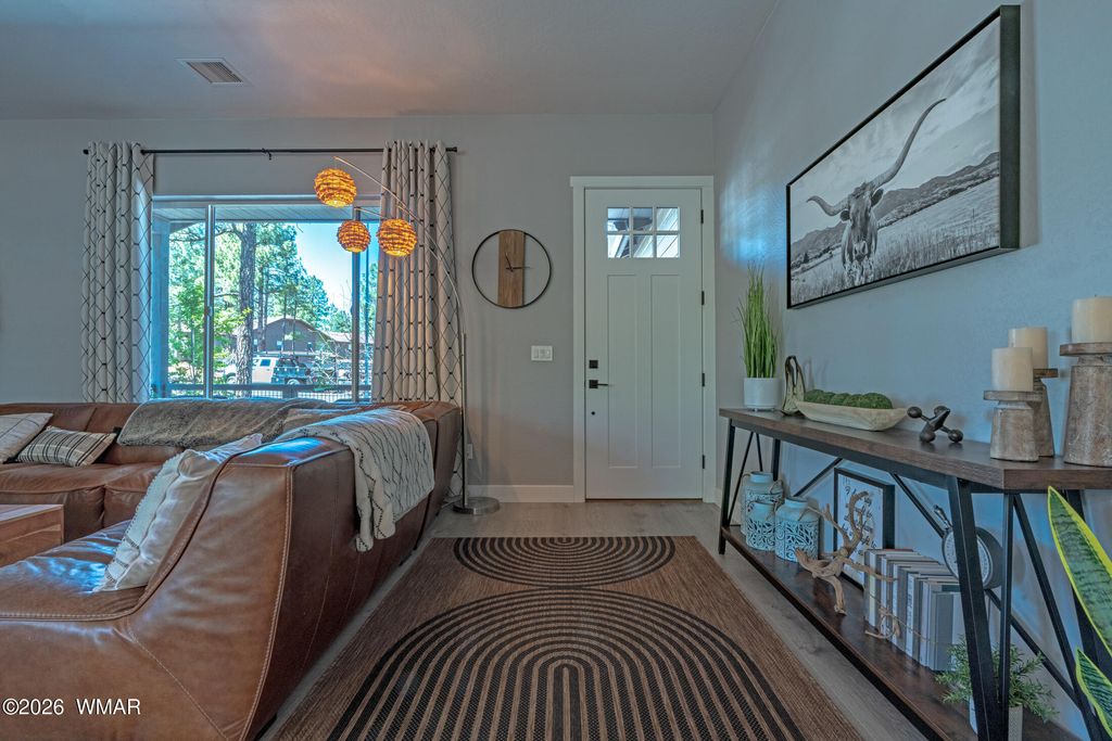 Like-new 2022 home showcasing exceptional craftsmanship and designer finishes throughout. From the moment you enter, you'll notice the attention to detail--high-end plank laminate flooring, oversized baseboards, 8-foot solid doors, and thoughtfully selected custom features at every turn. The stunning kitchen is the heart of the home, featuring solid maple cabinetry, quartz countertops, a stylish tile backsplash, and an oversized island with seating for five--perfect for entertaining. The open living space is anchored by a custom concrete entertainment center with a built-in electric fireplace, creating a warm and modern focal point. This home comes fully furnished with quality pieces, making it truly turnkey and ideal as a primary residence, second home, or short-term rental. Step outside to enjoy a 33-foot covered TREX deck overlooking professionally designed landscaping complete with irrigation and low-maintenance artificial turf--perfect for relaxing or hosting year-round. Additional upgrades include a water softener, tankless water heater, window coverings, and durable LP SmartSide exterior siding. Conveniently located within walking distance to local amenities, this property offers the perfect blend of comfort, style, and ease of living.