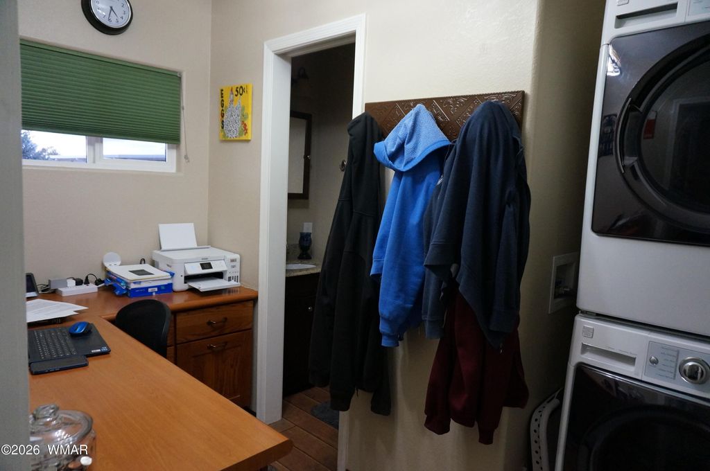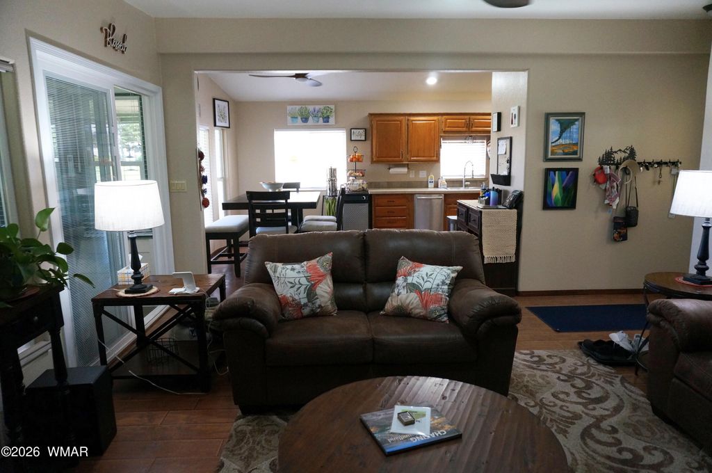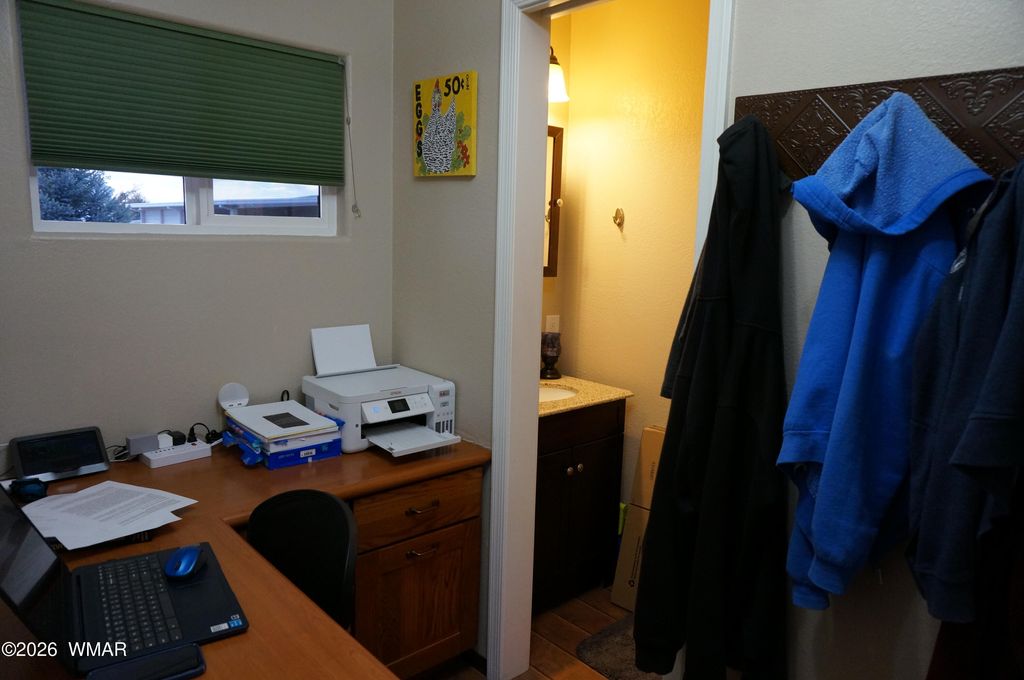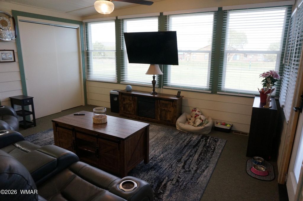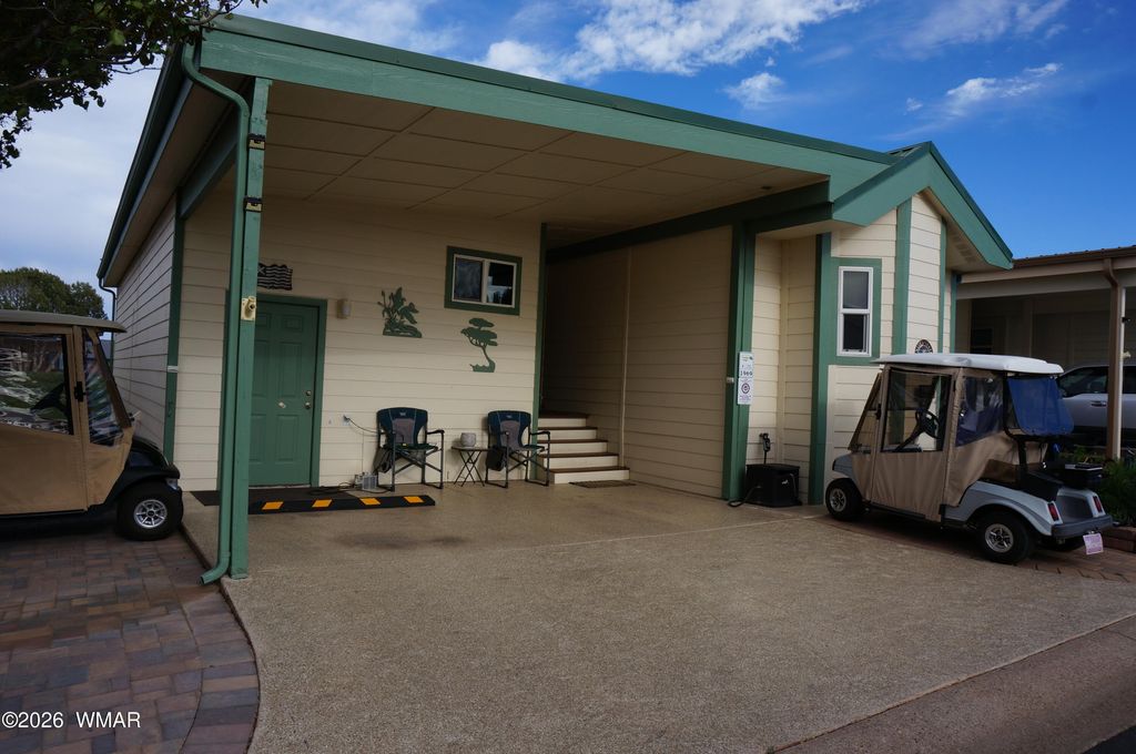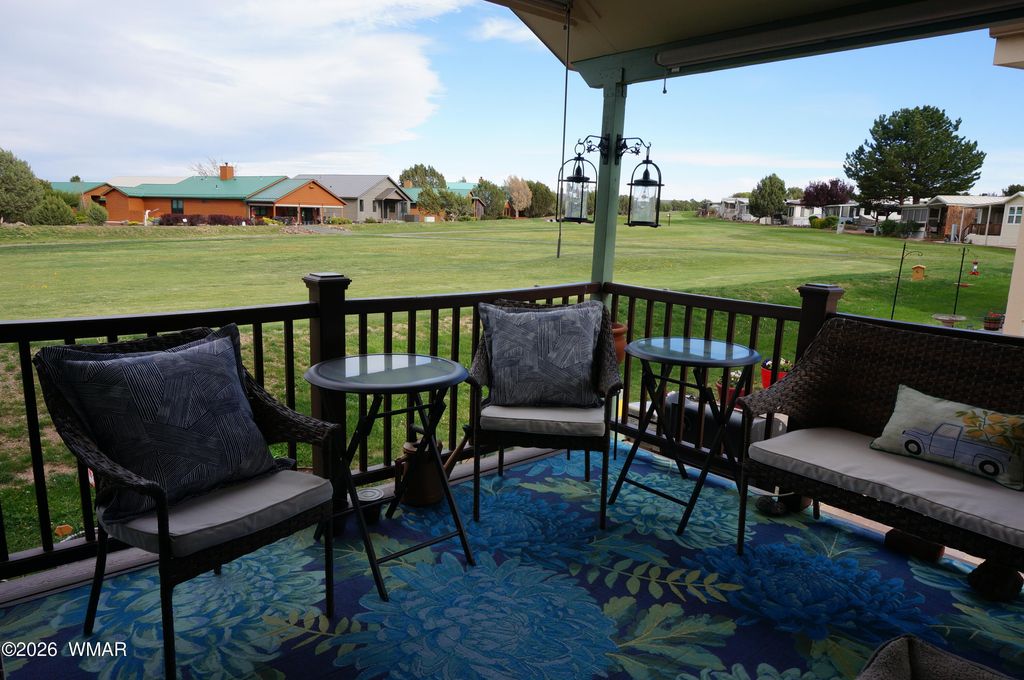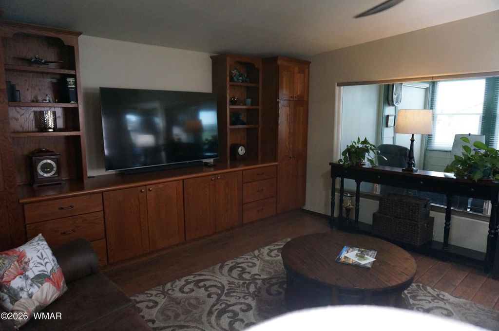 Wake up to golf course views and spend your evenings on a covered porch overlooking the green -- this 1-bedroom, 1.5-bath home with office delivers the Juniper Ridge lifestyle in a well-laid-out, move-in-ready package. The great room is anchored by a striking built-in entertainment wall with ample cabinet and drawer storage -- a custom touch that sets this home apart. A separate family room with oversized windows frames those golf course views and gives you flexible living space for guests or a quiet retreat. The kitchen offers stainless appliances including a range and over-the-range microwave, solid oak cabinetry, tile counters, and recessed lighting. A dedicated dining area and office round out the floor plan. The bedroom features built-in cabinetry and a built-in dresser/desk area -- functional and thoughtfully designed. Outdoor living is equally impressive, with a covered porch, decorative railing, and unobstructed views of the fairway. As a Juniper Ridge Resort resident, you'll enjoy access to a pool, spa, clubhouse, fitness facility, and tennis courts -- all within a gated, privately maintained community with paved streets. this home offers new HVAC System, furnished with 1year new furniture thru out including an adjustable bed, 6 new ceiling fans. Complete concrete pad with decorative pavers surrounding the property and the carport has a beautiful epoxy coating for protection. Golf cart is negotiable or will convey with full price offer. This is the one!!