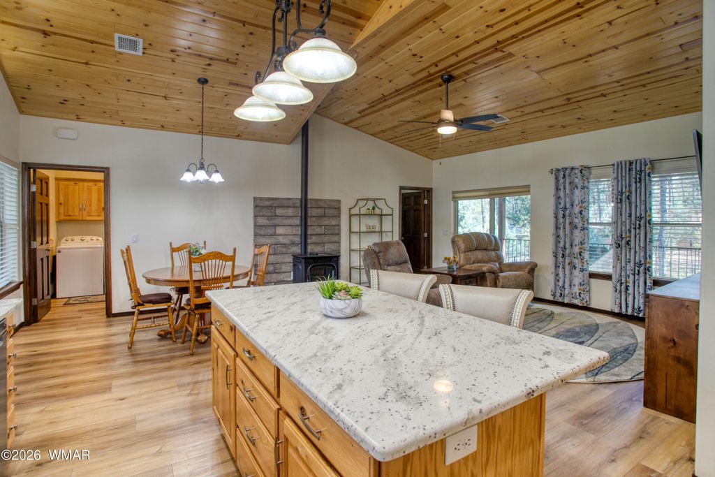Located in Show Low. Two Bedroom, two bath. BEING SOLD FURNISHED. Metal roof, one car garage w/room to tinker, landscaped w/walking path around back of house. Fenced yard. Very well maintained home w/pellet stove, granite counters, utility room, natural gas heat, air conditioning. Close to Summit Hospital, shopping, hiking and biking trails. Not far from Sunrise Skie Resort.